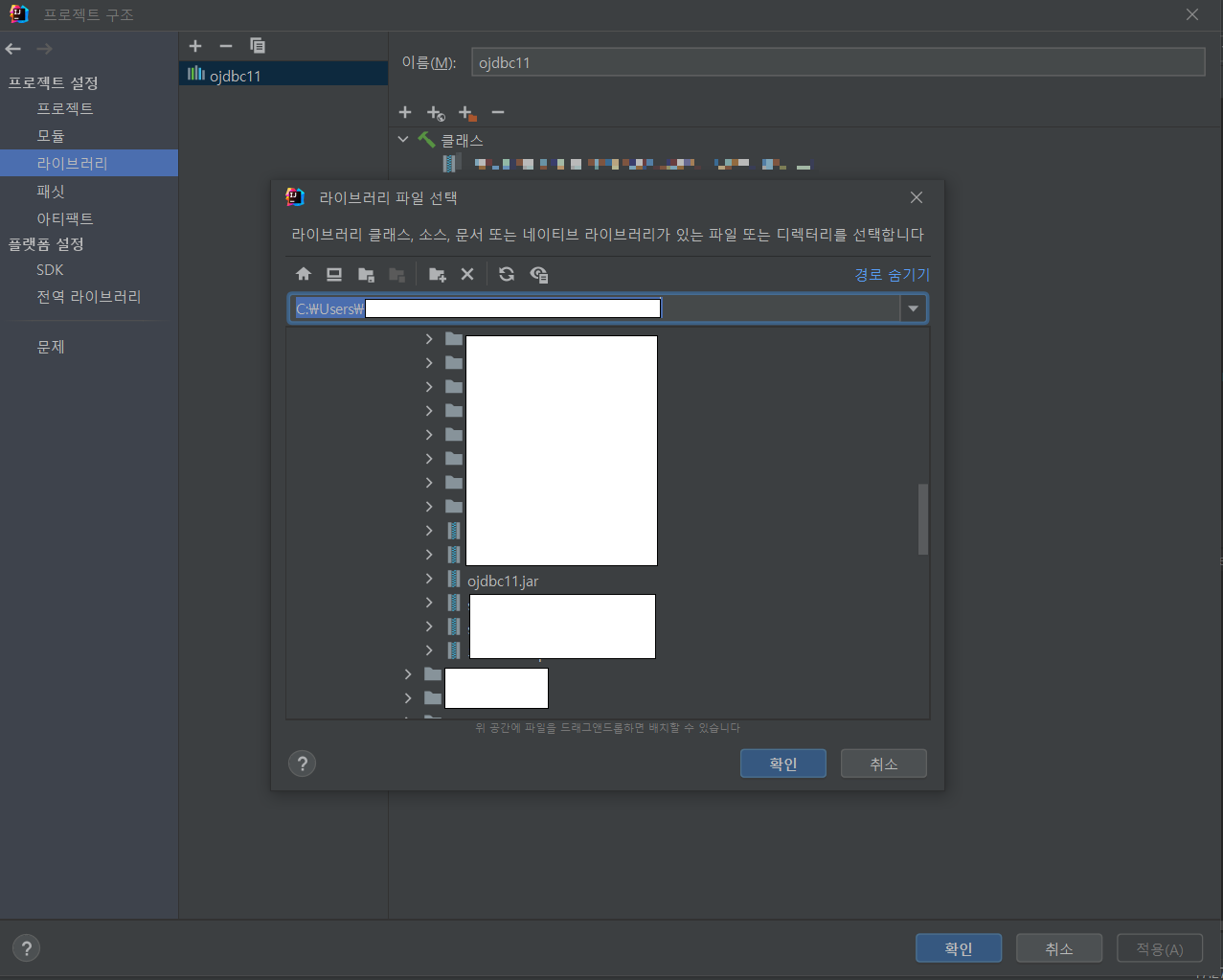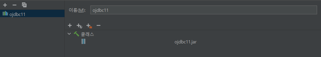 이후 좌측에 있는 프로젝트 설정 내 라이브러리를 클릭한 후 바로 옆쪽의 상단에 있는 + 버튼을 클릭한다. 그러면 라이브러리 파일 선택하라는 창이 나올 것이다. 여기서 다운받은 JDBC 드라이버 파일을 선택한 후 확인 버튼을 클릭한다.