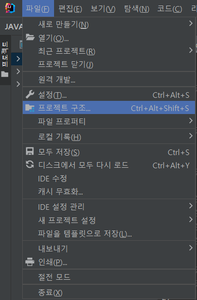 다운받았으면 인텔리제이에 접속한 후 한국어 기준으로 파일 -> 프로젝트 구조를 클릭한다.