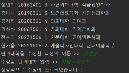 System.out.print("단과대학을 수정할 학생의 이름 >> ");