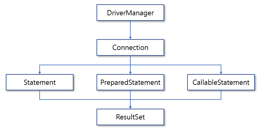 JDBC는 DriverManager를 시작으로 진행된다. 먼저 DriverManager 클래스는 드라이버를 로드하는 역할을 담당한다. 안에 getConnection()을 사용해서 드라이버와 연결할 데이터베이스의 정보를 Connection 클래스의 객체에 전달한다. 이후 객체를 바탕으로 Statement, PreparedStatement, CallableStatement를 sql문과 함께 사용해서 쿼리문을 읽고 실행한다.