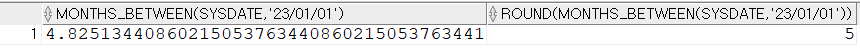 select MONTHS_BETWEEN(SYSDATE, '23/01/01'), ROUND(MONTHS_BETWEEN(SYSDATE, '23/01/01')) from DUAL;