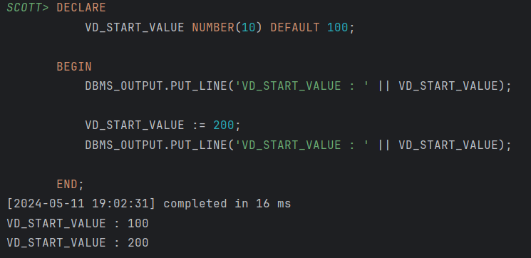 상단의 쿼리문은 DEFALUT라는 키워드를 사용한 PL/SQL문이다. 다음과 같이 DEFAULT 키워드를 사용해서 변수를 선언하면 별도의 값 또는 식의 대입이 없어도 기본적으로 설정해둔 값이 대입 및 활용가능하도록 설정할 수 있다. 또한 중간에 별도로 변수 안에 값을 임의로 대입할 수도 있다.