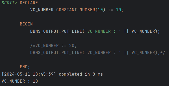 ORA-06550: 줄 7, 열5:PLS-00363: 'VC_NUMBER' 식은 피할당자로 사용될 수 없습니다, 줄 7, 열5 :PL/SQL: Statement ignored 라는 오류에 대한 알림이 발생하는 점을 확인할 수 있다. 이와 같은 오류가 발생하는 이유는 상수라는 키워드 특성상 한 번 값을 할당하면 더 이상의 재할당이 안되기 때문이다. 프로그래밍 언어처럼 상수는 변수와 달리 불변의 특성이 있다. 그렇기 때문에 상단 쿼리문을 실행하면 출력이 되지 않는다.