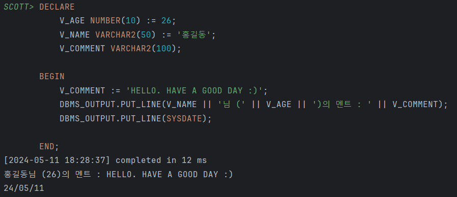DBMS_OUTPUT.PUT_LINE(V_NAME || '님 (' || V_AGE || ')의 멘트 : ' || V_COMMENT);