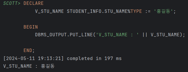 V_STU_NAME STUDENT_INFO.STU_NAME%TYPE := '홍길동';