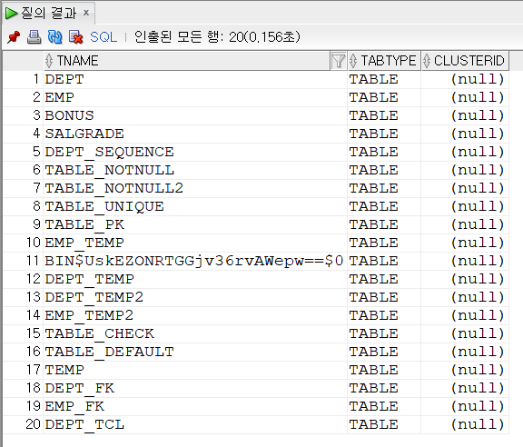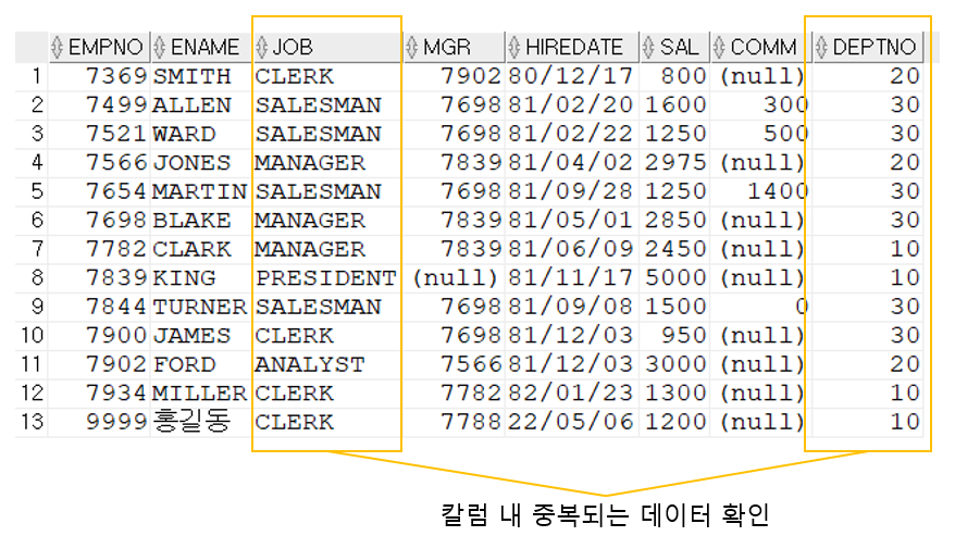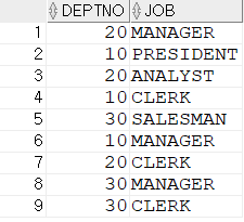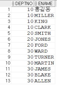 해당 코드를 입력한 후 실행하면 DEPTNO라는 칼럼 안에 30, 10, 20 총 3개의 필드가 조회되는 것을 확인할 수 있다. 이렇게 하나의 칼럼 외에도 여러 개의 칼럼의 중복성을 해결할 수 있다.