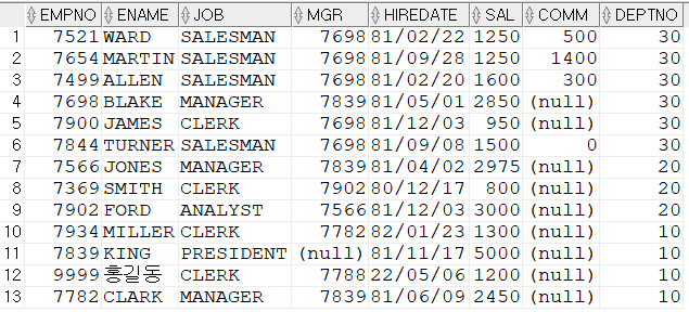 다음은 EMP 테이블의 모든 칼럼에 대한 데이터를 조회하는 명령어이다. 결과는 다음과 같다.